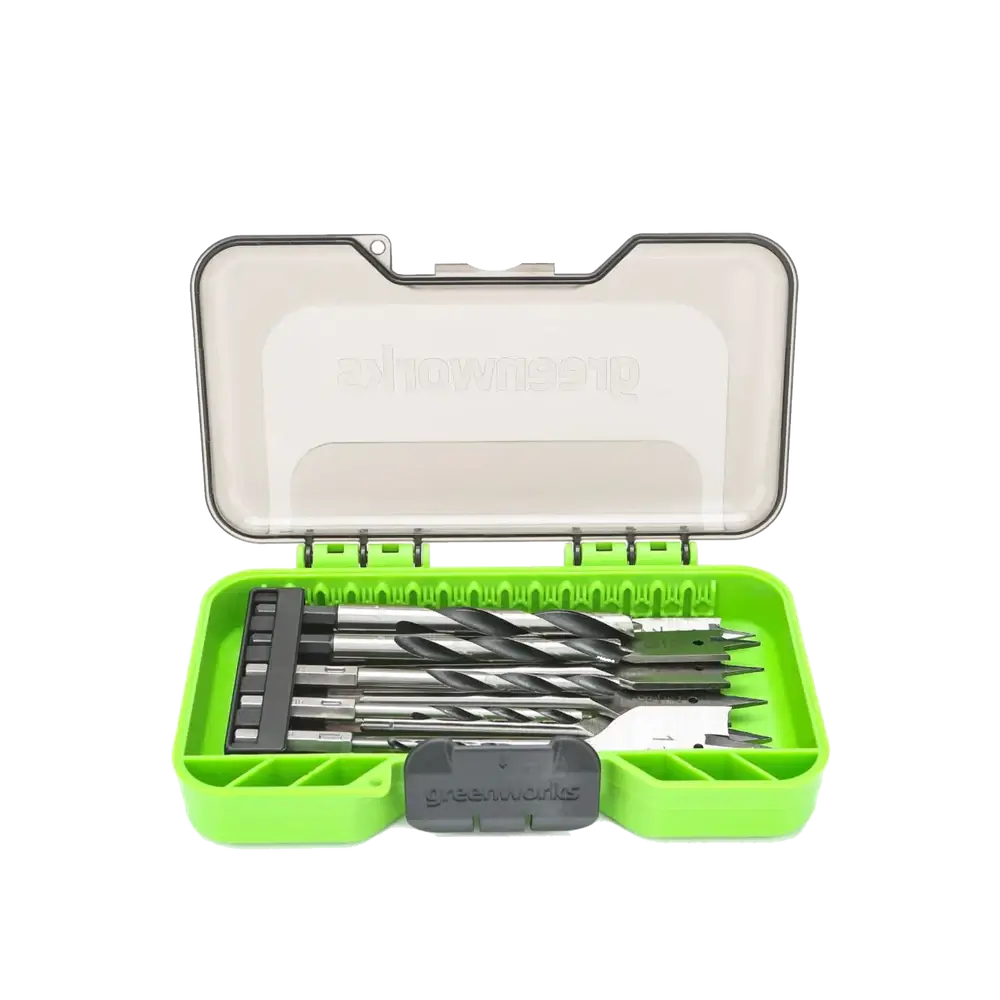 - Vključuje – 11 ploščatih in spiralnih svedrov od 4 mm do 25 mm za vrtanje lesa